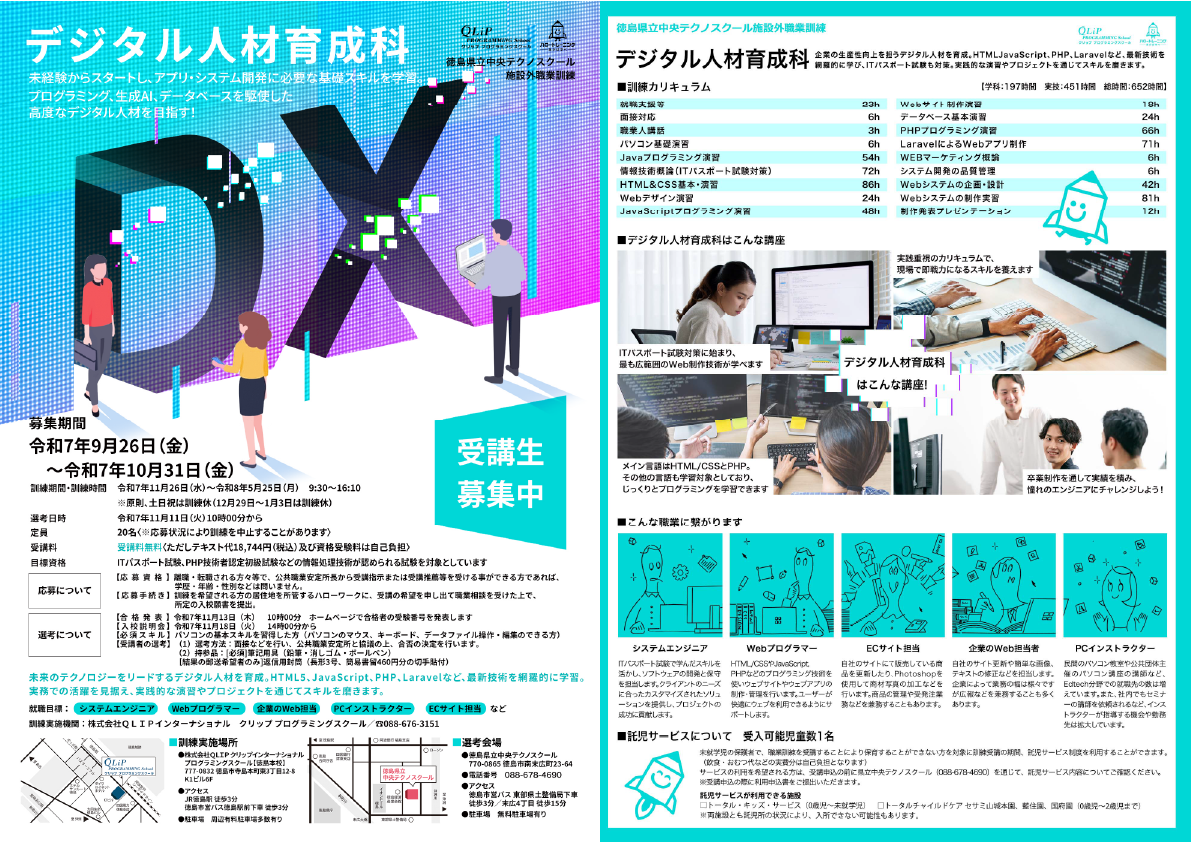 新たに始まる「デジタル人材育成科」-徳島県立中央テクノスクール施設外職業訓練-が現在募集中です。