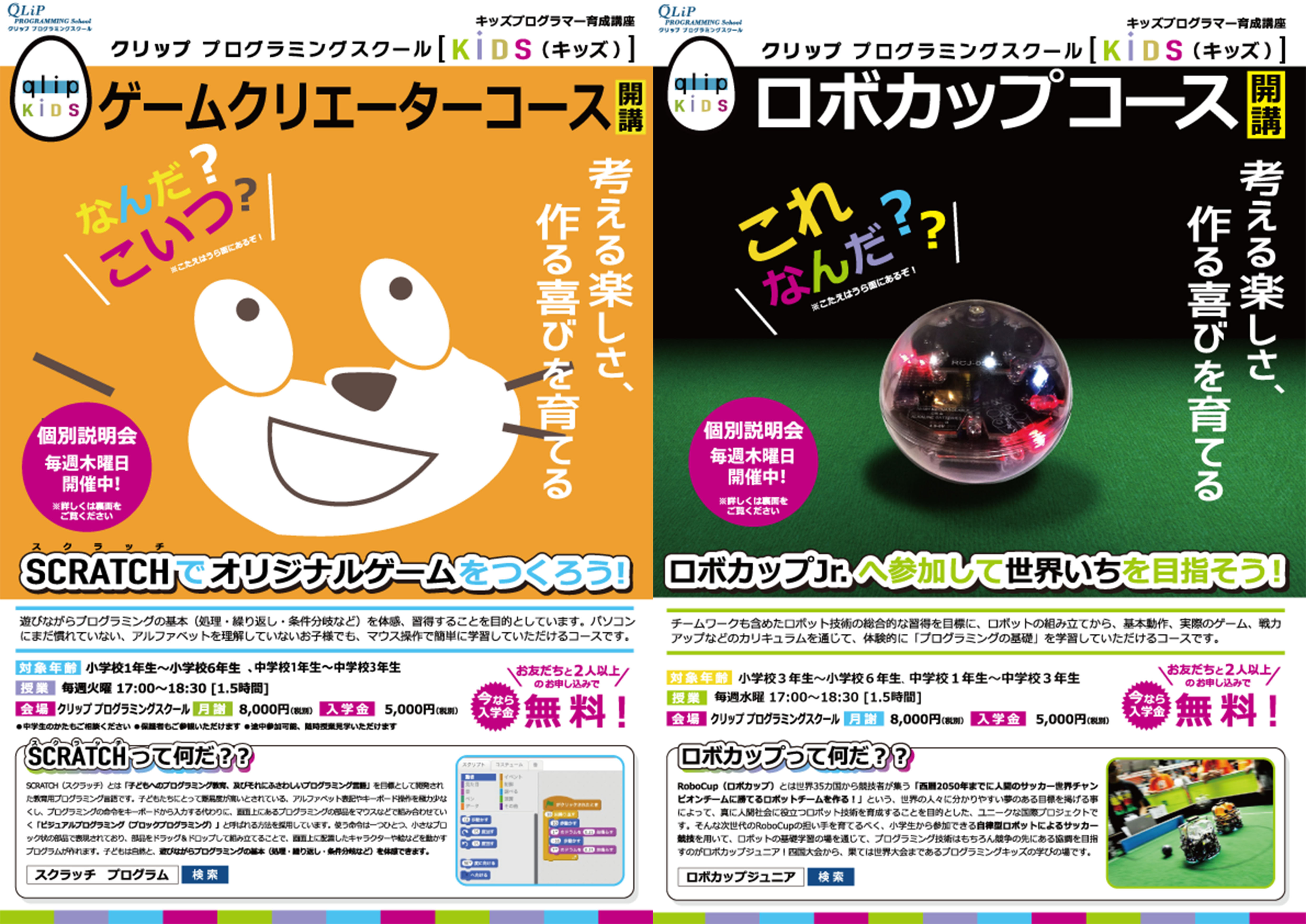 世界中の教育機関でプログラミング入門ツールとして利用されているScratch。初心者でも直感的にプログラミングの組み立て方を学べます。 ロボカップコースでは簡単なロボットプログラミングを基礎から学びます。実際にロボットを動かしながらプログラミングを学習します。 ゲームクリエーターコース&ロボカップコースの内容やスケジュールをご説明します。